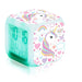 Notre radio réveil licorne, en forme de cube, dispose d'un mode veilleuse grâce à plusieurs lampes led à l'intérieur du réveil. Ces lampes lumineuses affichent 7 couleurs différentes ( bleu ciel, vert, rouge, violet, jaune, blanc, bleu). La luminosité des leds est réglable, ainsi, en fonction de la lumière de la pièce, vous pouvez paramétrer la puissance de la veilleuse.